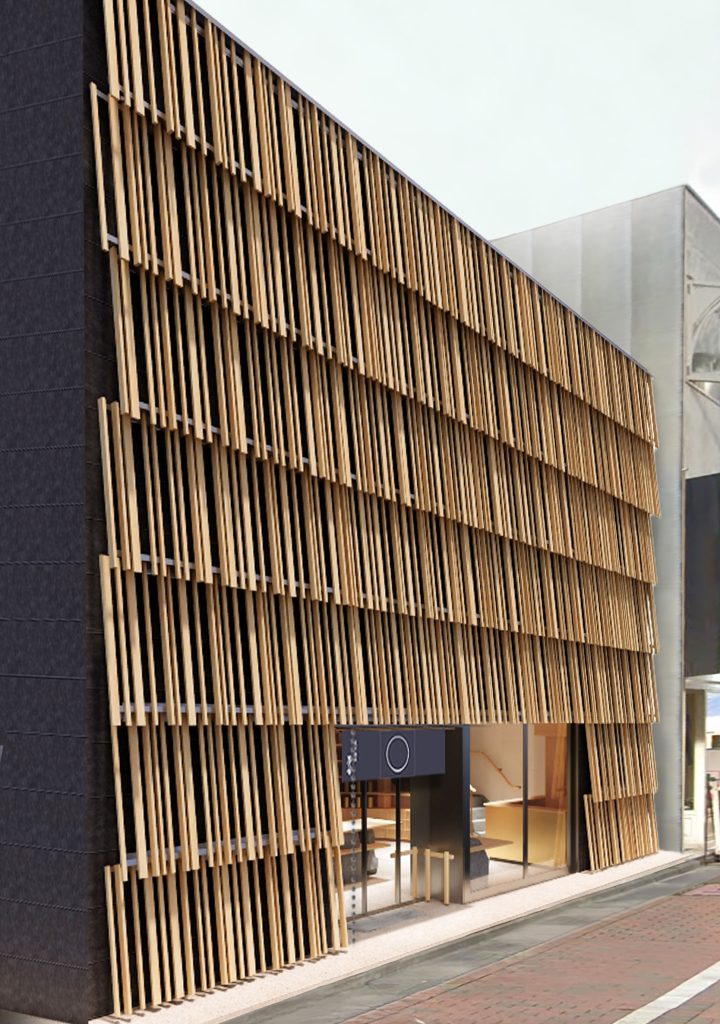 茅葺き屋根を想起させる杉格子の庇(ひさし)を重ねた温かみのある外観で、銀座の街並みに新たな息吹をもたらします。