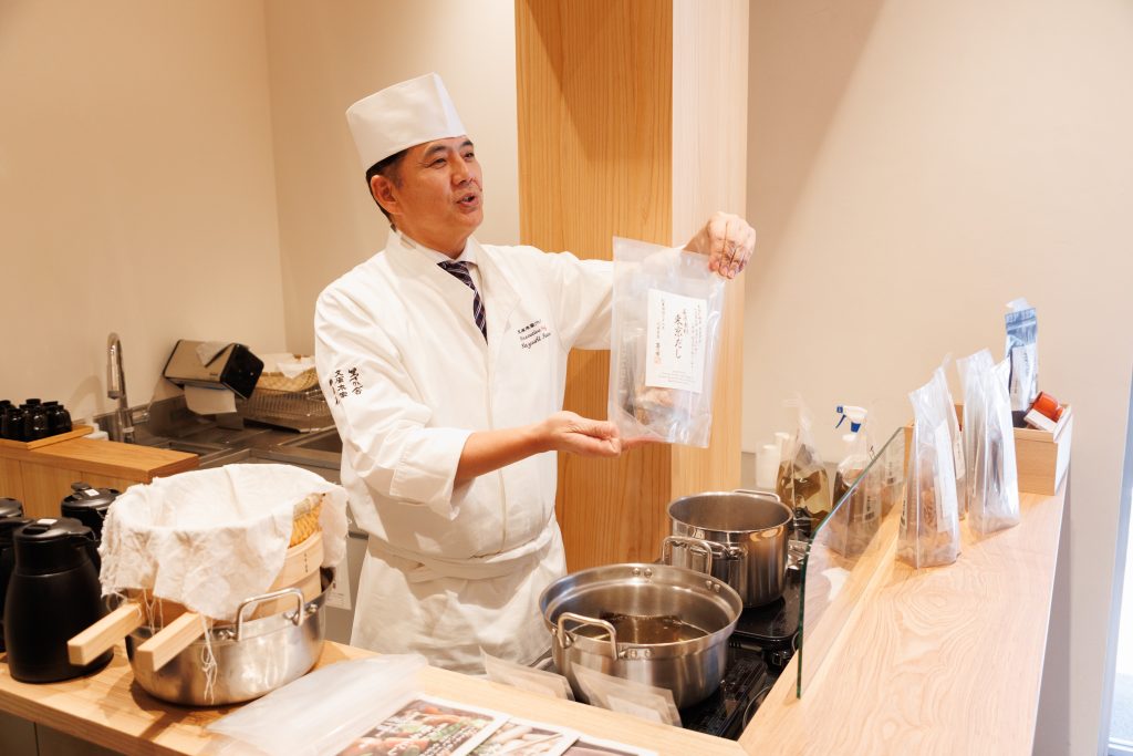 特に注目を集めたのは、茅乃舎として初めて本格的に取り扱う「乾物」です。1階では、各地域に根差した特色ある乾物素材を組み合わせた「茅乃舎 厳選素材 乾物キット」5種(東京、名古屋、能登、京都、博多)の中から、「東京」「博多」のだしのとり方についてのデモンストレーションを実施。また、5種類の「地域だし」の飲み比べもご体験いただきました。