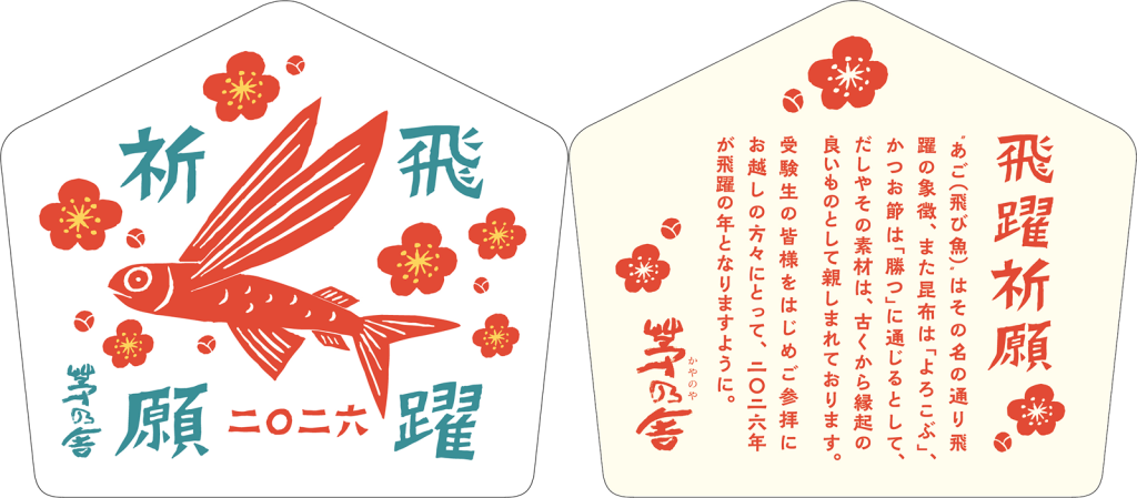茅乃舎のだしに使用している素材には、古くから“縁起の良い食材”として親しまれてきたものが数多くあります。“あご(飛び魚)”は飛躍の象徴、“昆布”は「よろこぶ」、“かつお節”は「勝つ」に通じるとして、受験生やそのご家族を応援する季節にふさわしい素材です。